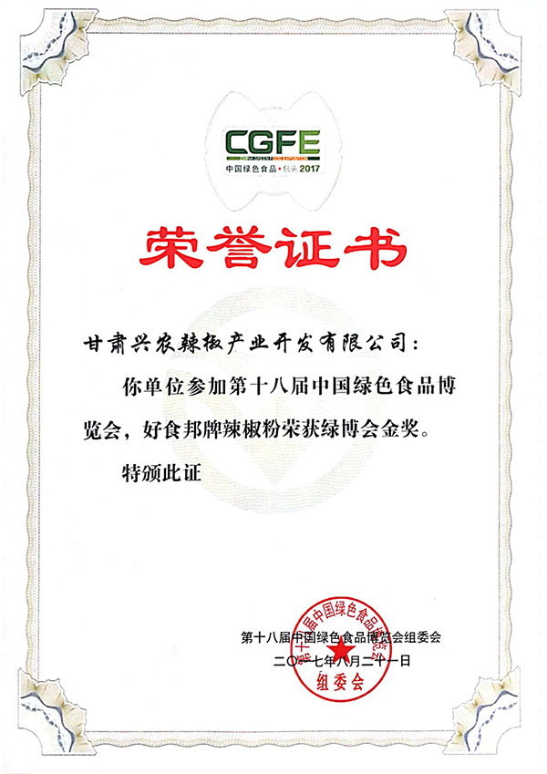 好食邦辣椒粉荣获十八届绿博会金奖