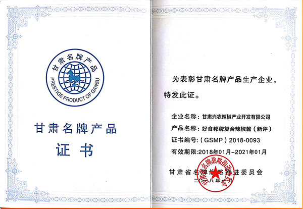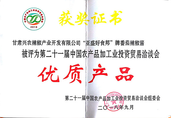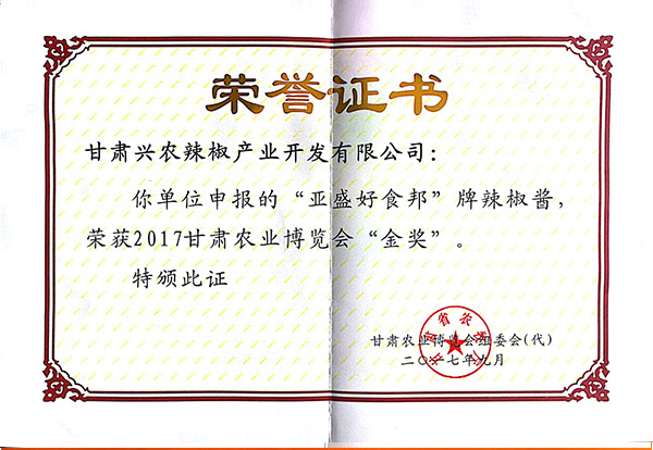 辣椒酱产品获奖证书